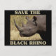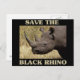 Uma aproximação de um Rinoceronte Negro com as palavras Salvar o Rinoceronte Negro ao seu redor.