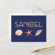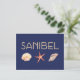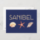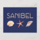 Sanibel Island, Florida conde design com estrelas-do-mar e conchas de cor-de-água e o nome Sanibel numa letra deco. O fundo azul pode ser alterado para outra cor, se quiser.