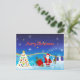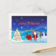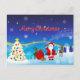 Linda paisagem de neve com uma árvore de Natal, flocos de neve, e um arco-íris sobre o céu. Papai Noel está acenando e duas renas estão juntas para distribuir presentes de Natal.