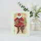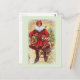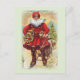 Vintage Papai Noel dizendo: "Feliz Natal." O santo Nick carregando o seu maço de guloseimas e brinquedos sobre uma ponte com uma ascensão de sol atrás dele.