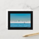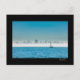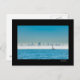 Cartão postal com um iate a navegar na Baía de São Francisco com a linha do horizonte da cidade a emergir da névoa atrás.