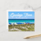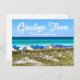 Saudações da Costa Esmeralda. Gorgeous Destin, cartão postal da fotografia da Flórida com guarda-chuvas azuis ao longo do litoral e com a inspiradora água do oceano verde-sereno azul e grama do mar. Cartões postais de férias de verão perfeitos.