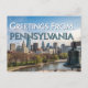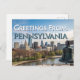 Um cartão-postal moderno e fotorealista que mostra uma vibrante visão do horizonte de Filadélfia, com o icônico Bell da Liberdade em primeiro plano. A imagem captura a mistura dinâmica da história e da modernidade, com o sino histórico contrastando com o pano de fundo dos arranha-céus elegantes da cidade e do rio Sereno. O texto ousado "Saudações da PENNSYLVANIA" faz deste um souvenir ideal para os visitantes que adoram esta cidade histórica e contemporânea.