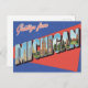 Este belo cartão-postal apresenta um design clássico de letras grandes "Saudações de Michigan" com um sentimento nostálgico e retrô. Cada letra de "MICHIGAN" é preenchida com uma cena única do estado dos Grandes Lagos, mostrando marcos icônicos como a majestosa Ponte Mackinac, a deslumbrante costa do Parque Nacional Pictured Rocks e as imensas Dunas do Urso Adormecido. A paleta de cores vintage e o fundo listrado adicionam ao seu charme antiquado, tornando-o um ótimo souvenir ou uma nota atenciosa para enviar a amigos e familiares. Ideal para viajantes, colecionadores de cartões-postais ou qualquer pessoa que ame a beleza natural e o espírito vibrante de Michigan.