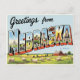 Este é um cartão postal clássico ao estilo vintage, com a frase "Saudações de Nebraska". As letras extensas e estilizadas de NEBRASKA contêm cada uma uma cena única ou um marco do Estado, incluindo a capital estadual, terras rurais e edifícios históricos. O primeiro plano mostra uma cena pastoral com ovelhas pastoreando em um campo verde. O design tem uma sensação nostálgica do século médio com sua paleta retrorcolorida e fonte ousada, fazer-a perfeita para produtos como postais, posters e t-shirts para qualquer pessoa que ame arte viagens vintage ou o belo estado de Nebraska.