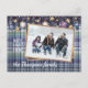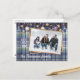 Cartão de Férias único, clássico, moderno, bonito e decorativo. Adorável com texto COM AMOR DE e espaço para personalizar ou personalizar com uma foto e nomes (ou nome da família) de sua escolha em um estilo rústico de cabana no campo com padrão xadrez violeta roxo, azul escuro, verde-teal e cinza. E um poema de saudação de temporada personalizável no verso do cartão.