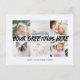 Cartões-postais com uma colagem de fotos elegante com 6 imagens personalizadas, sua mensagem de saudações em uma fonte manuscrita elegante, seu nome, data, ano, mensagem no verso em uma fonte sans serif moderna e simples.