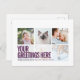 Cartões-postais de Saudações Universais Modernas e Elegantes com 6 fotos familiares personalizadas roxo e branco com uma colagem de fotos estilosa com 6 imagens personalizadas, sua mensagem de saudações em negrito e fonte sans serif moderna e chamativa, seu nome, data, ano, mensagem no verso em uma fonte tipográfica minimalista e sans serif legal. Estética minimalista preta e branca, mas você pode editar o cartão-postal em qualquer cor.