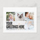 Saudações Universais Modernas e Afiadas personalizadas com 6 fotos de família, Cartões Postais com uma colagem de fotos elegante com 6 imagens personalizadas, sua mensagem de saudações em negrito e fonte sans serif moderna e atraente, seu nome, data, ano, mensagem no verso em uma fonte tipográfica minimalista e sans serif legal. Estética minimalista em preto e branco, mas você pode editar o cartão postal em qualquer cor.