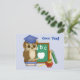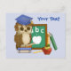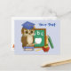 Coruja-de-olho-de-gato com maçã, livros e outros de volta às ferramentas escolares. Personalize a área de texto do cobrir.