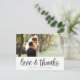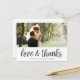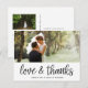 Um obrigado fotográfico moderno, que você postcard, desenhado para acomodar sua foto favorita de casamento horizontal ou orientada a paisagem. "Amor e obrigados" aparece na parte inferior em um roteiro de estilo manuscrito preto. Personalize com seus nomes e/ou data de casamento abaixo. Cartões postais inversos para mostrar seu endereço de devolução com espaço amplo para endereçamento do destinatário, bem como uma mensagem pré-impressa opcional e uma foto adicional. Se você preferir adicionar uma mensagem manuscrita, simplesmente exclua o texto de exemplo mostrado.