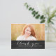 Cartões de agradecimentos de Graduação Russo do Script Branco Trendy. Design por Elke Clarke © Visite nosso compro www.zazzle.com/monogramgallery* para mais cores e estilos. Adicione sua própria foto e texto. Uma simples cobertura de texto de fonte de script manuscrito de tipografia branca em um fundo de quadro negro (efeito fotográfico impresso) com as palavras "Obrigado". Substitua a foto de exemplo por sua.
