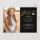 Este anúncio de graduação de dois na moda de dois lados ou obrigado que você faz, apresenta texto moderno fundido com um roteiro elegante de caligrafia em ouro e branco em preto real. As fotos são uma na frente e outra na parte de trás. Para ver mais itens como este, visite minha loja aqui em "www.Zazzle.com/LakeViewCardCo". Obrigados