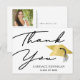 Cartão de agradecimento de formatura minimalista elegante com tipografia moderna de letra manuscrita, um boné de formatura em folha metálica dourada falsa e personalizado com o nome do graduado e ano de formatura na frente. O lado oposto oferece a opção de pré-imprimir sua mensagem de agradecimento ou excluir o texto de exemplo para deixar a área em branco para anotações manuscritas de agradecimento. Design preto, dourado e branco. ASSISTÊNCIA: Para obter ajuda com modificação de design ou personalização, alteração de cor, transferência do design para outro produto ou se você deseja itens coordenados, entre em contato com o designer ANTES DE COMPRAR por meio da guia de MENSAGEM do Zazzle Chat ou envie um e-mail para makeitaboutyoustore@gmail.com.