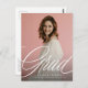Com seu texto elegante, este anúncio de formatura de uma foto e o cartão-postal de convite é a forma perfeita de celebrar seu formando e mostrar uma bela foto de mais velho. Este design vertical apresenta um script clássico "formando" junto com seu texto personalizado - nome, escola, ano etc. Na coordenação de volta, você encontrará espaço para os detalhes do convite de festa de formatura na correspondência de texto sofisticado. Este simples mas na moda é parte de uma coleção de Lea Delaveris Design. Encontre mais cores e estilos junto com decoração, suprimentos de festas e muito mais.