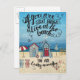 Vivendo na praia - poster de inspiração midiática mista, com pequenas casas, cadeiras de salão e guarda-chuvas na praia arenosa. Ilustração tipográfica desenhada à mão | Bigstock® - Todos os direitos reservados.