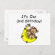 Três macacos pequenos, dois meninos e uma menina, e uma banana amarela grande em T-shirts de segundo aniversário Triplets, fato físico, sacos de tote, cartões, adesivos, ímanes e muito mais.