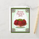 A minha representação de um pacote de sementes para sementes de herança de morango. Bela tigela de morangos com fundo verde de gingham e estrutura de ornamentado.