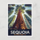 Capture the awe-inspiring scale of Sequoia National Park, California, with this dramatic retro travel postcard. The design showcases the colossal height of the ancient Giant Sequoia trees towering toward the sky, minimizing the hiker beneath to emphasize their immense size. This artwork perfectly conveys the grandeur and majesty of this California natural landmark, making it an excellent piece for nature lovers and collectors of US National Park posters.