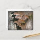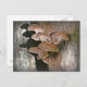 Esta carta postada apresenta cogumelos shiitake crescendo em um tronco na floresta.