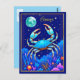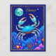 Cartão postal com uma ilustração do signo zodiacal de Câncer, apresentando um grande caranguejo azul com detalhes laranja, contra um céu noturno estrelado. Uma lua cheia brilhante paira acima, enquanto flora marítima colorida e sonhadora preenche o primeiro plano.