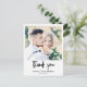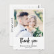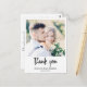 Este obrigado de casamento moderno que você faz com o cartão-postal mostra a fotografia do casal em uma simples estrutura branca. O título está em uma letra de caligrafia de pincel preto. Tanto a frente como a parte de trás desta obrigado de casamento que o seu cartão postal está pronto para ser personalizado. Esta obrigado que você faz é adequada para um casal procurando por um moderno obrigado de casamento com fotos causais.