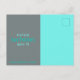 Este cartão postal de Save the Date é projetado de forma simples com blocos de cores coral, azul turquesa e cinza. Ele apresenta uma imagem na frente com nomes impressos sobre um bloco de cor coral. Os detalhes são indicados no verso sobre um bloco de cor cinza. Blocos de cores azul turquesa e cinza dividem o verso, sobrepostos com texto azul turquesa.