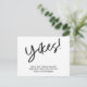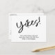 Isto é para vocês se vocês estiverem querendo adicionar uma dica de levidade a uma situação desafiadora. A frente apresenta um cabeçalho gráfico que eu desenhei usando uma fonte moderna e casual de escrita manual, que diz "Yikes!". Abaixo, há uma mensagem alegre que você pode editar, que declara sua notícia: "Ainda estamos nos casando! Neste momento, não temos certeza de quando isso acontecerá." Use os campos modelo para adicionar seus detalhes pessoais e alterar qualquer um dos meus rascunhos para adequá-los às suas necessidades e situação.