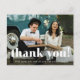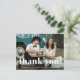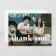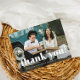 Cartaz de cartões de agradecimentos de fotos simples e caprichosa apresenta tipografia branca e uma foto na frente, com um obrigado editável que você envia com o endereço de retorno no verso.