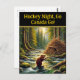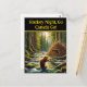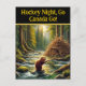 Um castor se posiciona em um rio correndo, segurando um galho como se fosse um violão, em frente a um abrigo de castor em uma floresta.