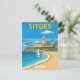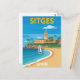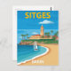 Capture o charme ensolarado da costa espanhola com este cartão postal em estilo vintage apresentando Sitges, Espanha. A obra de arte mostra um veleiro no mar azul claro, a icônica igreja da cidade na encosta da colina e a bela praia curva ladeada por palmeiras. O design estilizado e colorido evoca a idade de ouro das viagens, tornando-o perfeito para uma lembrança de férias, um bilhete para um amigo ou uma peça de arte retrô para sua casa.