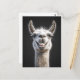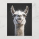 Um close muito detalhado de uma lhama branca sorridente com olhos expressivos e uma expressão cômica amigável contra um fundo escuro.