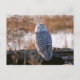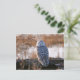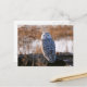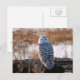 Foto de uma coruja de neve piscando. A coruja está sentada sobre um pedaço de madeira derivada na praia cercada por vegetação seca. Esta imagem de coruja pode ser personalizada com o seu próprio texto no estilo de texto da sua escolha.