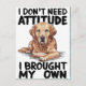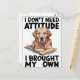 Um desenho de um cão real com as palavras que não preciso de atitude que trouxe por cima, mostrando uma postura confiante e independente.