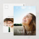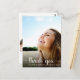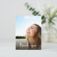 Um cartão postal de agradecimento de graduação moderno com a foto do graduado sobreposta com "obrigado" em um roteiro branco com floreios e o nome e ano de turma em tipografia branca simples. No verso, adicione uma foto adicional, personalize uma mensagem de agradecimento e adicione o nome deles em um roteiro semelhante a uma assinatura.