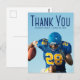 Obrigado escrito em tipografia azul alta sobre a foto de graduado de sua foto de retrato sênior torna um simples cartão postal de agradecimento de formatura para um jogador de futebol em uma equipe esportiva. Personalize com seu nome e turma de 2026 nestes cartões postais de graduado com sobreposição de texto minimalista. Escreva uma mensagem personalizada de agradecimento no verso.