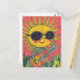 Um adorável sol amarelo vestindo óculos de sol e tocando violão com fundo rosa e plantas verdes geradas por IA