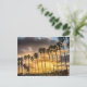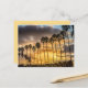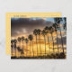 Cartão postal com uma fila de palmeiras com um pôr do sol ouro atrás delas na costa da Califórnia. Foto tirada em La Jolla, Califórnia.