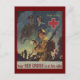 Cartaz da Cruz Vermelha encorajando a adesão para ajudar os soldados em campo. Soldado entrando em batalha com seu rifle e "xícara de joe". Legenda: "A Cruz Vermelha está ao lado dele!"