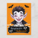 Este cartão postal do Dia das Bruxas apresenta um vampiro sorridente mostrando suas presas, com morcegos voando por aí.