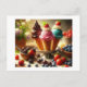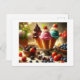 Três cones de sorvete em diferentes sabores sentam-se elegantemente num pedestal, rodeados por uma variedade de frutas frescas e por um buquê exuberante de flores. Cores vivas e detalhes intrincados criam uma cena convidativa e deliciosa.