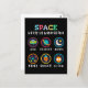Playful space themed artwork made for curious kids and young students. Cute symbols like UFO, planet, moon, stars, rocket and alien help children explore space science and basic astronomy in a fun and friendly way.