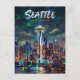 The colors of the night are moody and maritime, featuring deep emeralds, cool grays, and pops of neon magenta. The light reflects off the damp pavement and the dark water, giving the entire scene a fresh, rain-kissed glow that is uniquely Seattle.