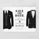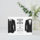 Avise a todos que vocês se estabeleceram em uma data para o seu casamento com este moderno, salve o cartão de data com dois trajes pretos. Personalize adicionando seus nomes, data e local do casamento.
