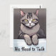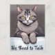 Cartão-postal, ilustrando uma cinza de aparência estéril por gato com olhos amarelos piercing que repousam as patas frontais sobre uma borda, mirando diretamente para a frente com um ar de autoridade séria. Abaixo do gato, o roteiro ousado diz, "Precisamos conversar", acrescentando humor e drama.