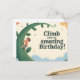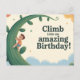 Uma ilustração digital caprichosa e encantadora criada como uma saudação de aniversário. Ela retrata um menino feliz em uma camisa listrada e shorts, subindo ansiosamente um enorme pé de feijão verde curvo que se estende em direção a um céu repleto de nuvens suaves e pintadas em tons quentes de creme, laranja e azul. Estrelas espalhadas adicionam à atmosfera mágica, e o texto divertido diz: "Suba num Aniversário incrível!"