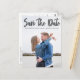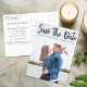 Salve a Nova Data escrita em tipografia de cinza em branco-chic neste cartão postal de fotografia de noivado lindo. Adicione sua própria fotografia de casal sangrando neste moderno minimalista Salve a Data e personalize os detalhes do casamento e o site na parte de trás desses cartões postais simples.