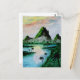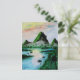 uma pintura tradicional de paisagem aquosa de montanhas verdes em frente a um lago e selva verde sob um pôr do sol colorido em um cartão postal