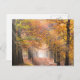 Cartão-postal de raios de luz criados por raios solares através da folhagem das árvores ao longo de um caminho através de uma floresta no nevoeiro matinal do outono.