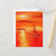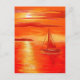 Pintura a óleo de um casal navegando em um barco de vela contra um pôr do sol vermelho quente. Imagem disponível em vários presentes e produtos. Cartões postais.
